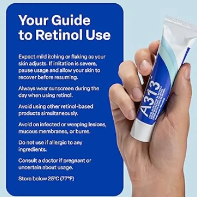 يُعد A313 من أشهر مستحضرات العناية الصيدلانية الفرنسية الغنية بفيتامين A، ويُباع دون وصفة طبية في فرنسا. يحتوي على 200,000 وحدة دولية من ريتينيل بالميتات (ما يعادل 0.06% من فيتامين A)، بتركيبة فعّالة تستهدف علامات التقدم في السن وتجدد البشرة بعمق.