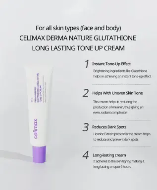 يُعد Celimax Derma Nature Glutathione Tone-UP Cream كريمًا متطورًا للعناية اليومية بالبشرة، مصممًا لمنح إشراقة فورية وتوحيد ملحوظ في لون البشرة مع ترطيب متوازن يدوم طوال اليوم. تساعد تركيبته الغنية بمضادات الأكسدة على تحسين مظهر البشرة الباهتة وتعزيز نضارتها الطبيعية.